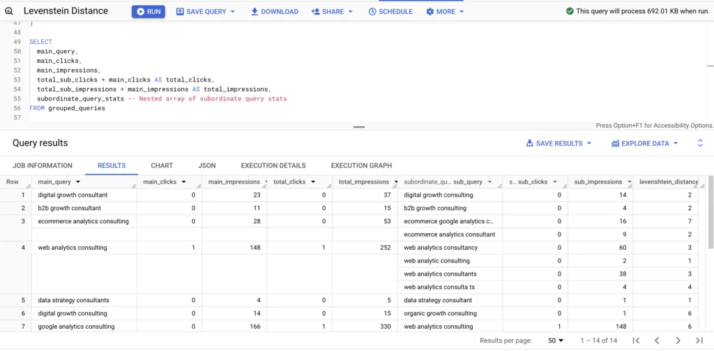 The final SELECT statement produces the output that presents each main query along with its total clicks and impressions, which are calculated by adding the main query’s metrics to the aggregated subordinate query metrics. It also provides a nested structure (subordinate_query_stats) that contains detailed statistics for each subordinate query. This comprehensive output enables deeper analysis of the relationship and performance of similar search queries, helping to identify trends and optimize search strategy around the most effective queries.