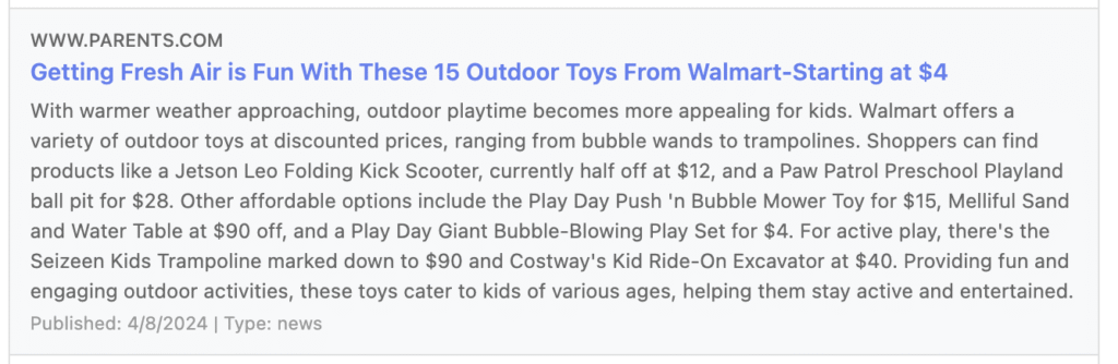 Another interesting facet of ChatGPT’s search results is that they tend to incorporate search results from “news” articles (non-evergreen articles from publishers that appear to be time-bound). Notably, the snippets that accompany these pages are longer (AI-generated) summaries of the page’s contents.