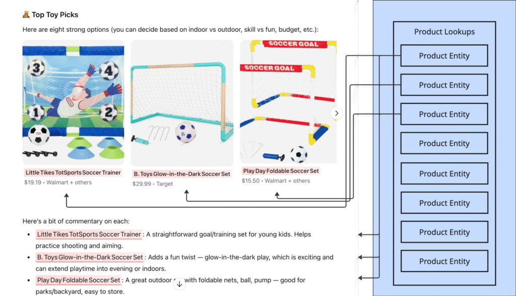 In parallel, ChatGPT queries a separate product database to retrieve structured data for each product entity it lists in the response.